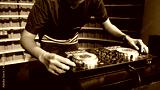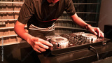 portrait of a male with hat Disc jockey or dj playing turn table, mixer, music