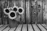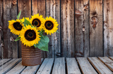 A rusty can filled with a bouquet of sunflowers on a rustic wooden plank table with space for copy.