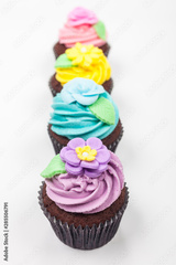 Four Chocolate Cup Cakes With Colorful Icing or Frosting