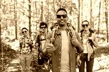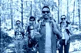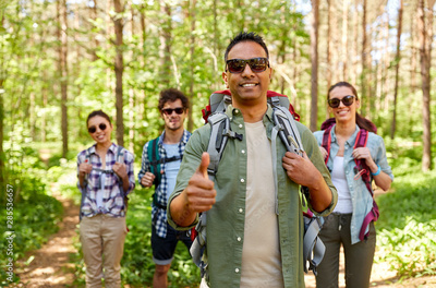 travel, tourism, hike and people concept - group of friends with backpacks and indian man showing thumbs up gesture in forest