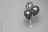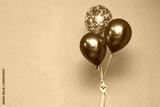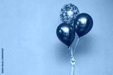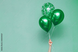 stylish birthday party or holidays with balloons. three green balloons on the green background with copy space for text. Hand holding three bright colorful balloons indoor.