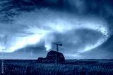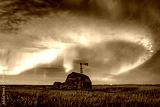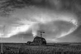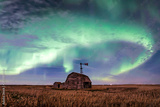 Swirl of bright Northern Lights over vintage barn, bins, windmill and stubble in Saskatchewan, Canada
