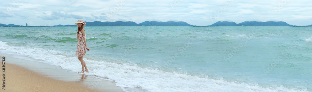 Young happy woman walking on the beach, summer beach vacation holiday travel concept.