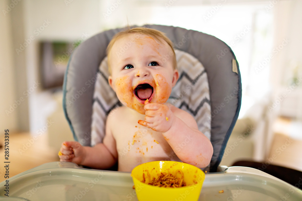A Little baby eating her dinner and making a mess