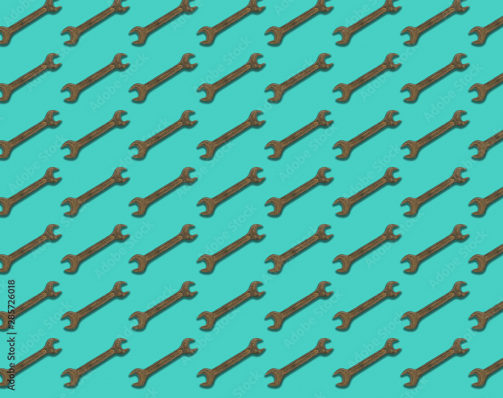 Seamless pattern of old retro metal spanner tool isolated on electric green background - flat layout