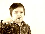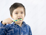 Portrait of little boy wearing pajamas holding a tooth brush over white background, Studio portrait of a beautiful child mixed race boy with a toothbrush isolated, Health care concept