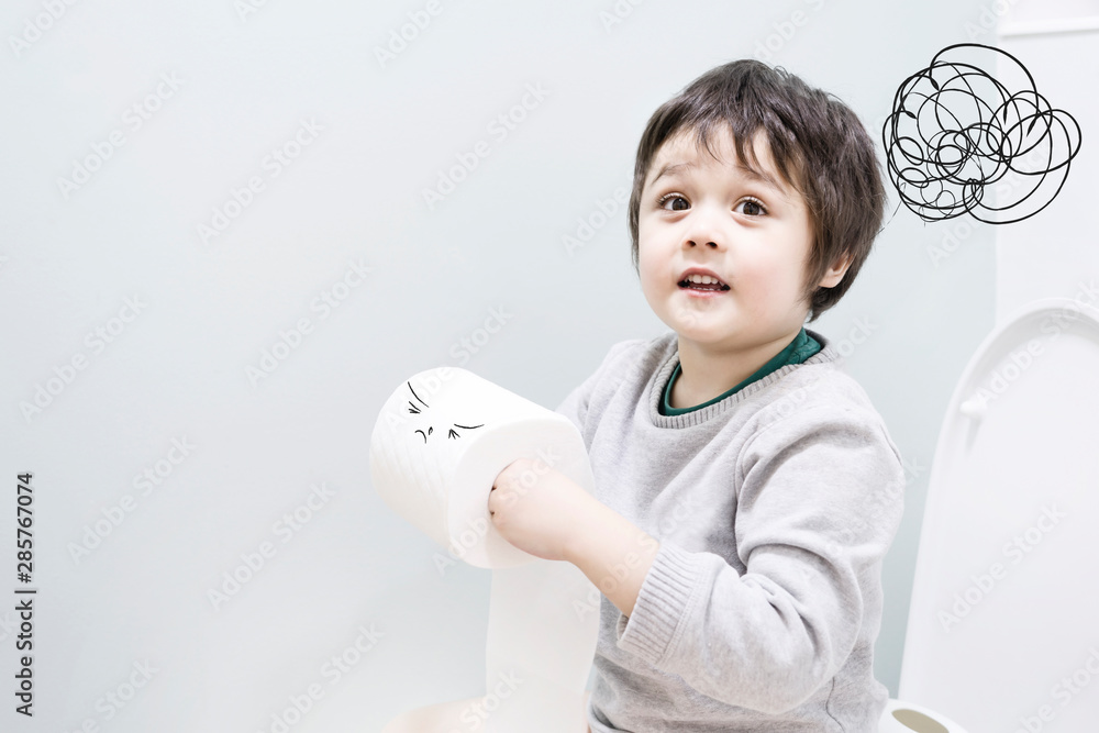 Active boy playing and having fun with tear toilet paper in toilet, kid making messy with toilet roll looking at camera with surprised face,copy space, Training child or Health care concept