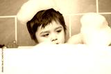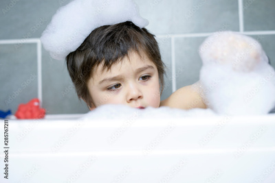 Close up face of adorable toddler boy taking a bath with a lot of bubbles in bathtub, Happy cute little boy playing with foam in the bathroom, Children Health care concept