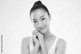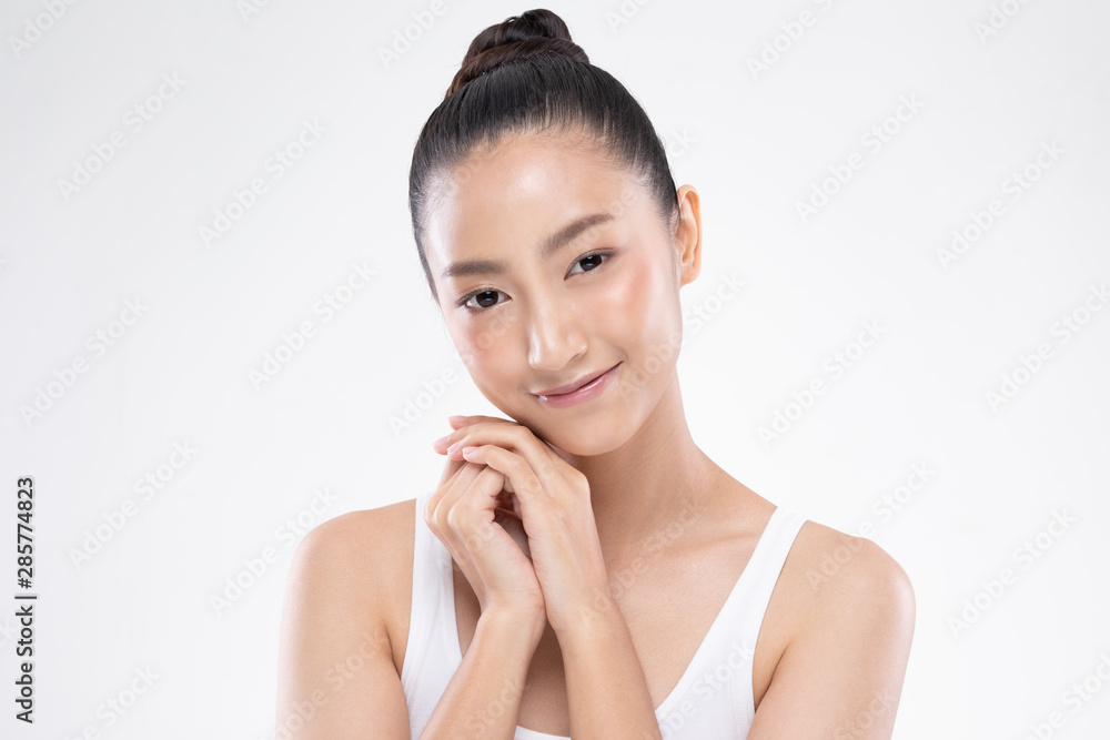 Beautiful Young Asian Woman Holding Hands smile feeling so happy and cheerful with healthy Clean and Fresh skin,isolated on white background,Beauty Cosmetology Concept