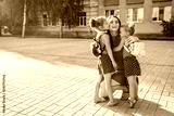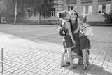 Happy mother meeting her kids daughters after classes outdoors primary school. Family hugging. Back to school