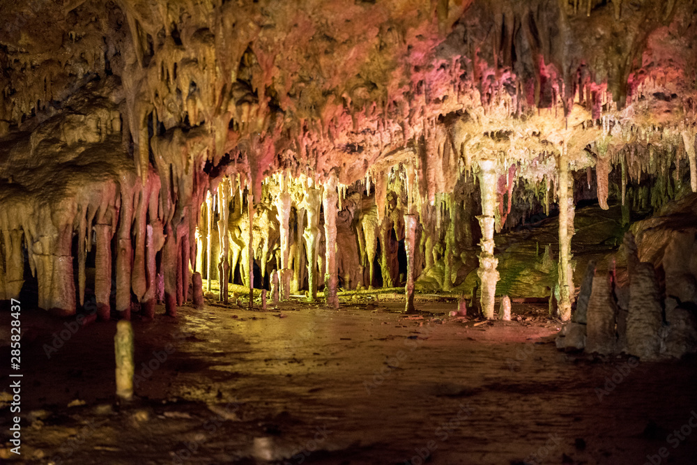Cave dark interior with light, stalactites and stalagmites