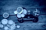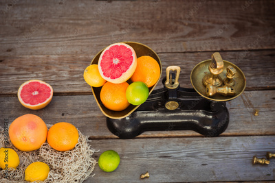 Top view Fresh citrus fruits in vintage scale and several oranges, lemons, grapefruit, lime on the old rustic wooden table with a few weights. Detox diet. Harvest concept. Farmer market. Copy space.