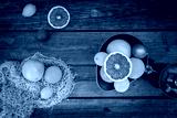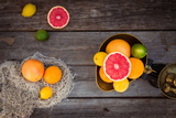 Top view Fresh citrus fruits in vintage scale and several oranges, lemons, grapefruit, lime on the old rustic wooden table with a few weights. Detox diet. Harvest concept. Farmer market. Copy space.