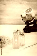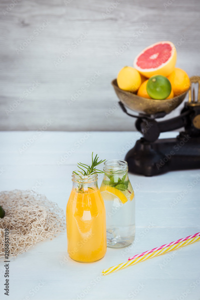 Two bottles with homemade lemonade and orange fresh juice with mint and ice on the white wooden background with fresh citrus in vintage scale and some friuts. Healthy Summer drinks. Vertical card.