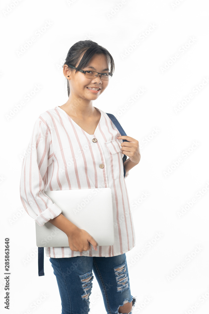 Young Asian girl student with school bag isolated on white background, learning and education kid concept