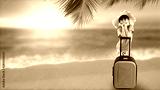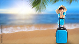 Young pretty Asian kid with travel bag in summer style, Thai girl wearing hat with sea and beach background in vacation