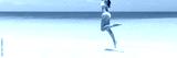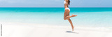Sexy bikini body perfect slim legs for summer beach holidays panoramic banner. Woman jumping of happiness for weight loss, laser treatment for cellulite, hair removal, concept. Copy space on ocean.