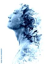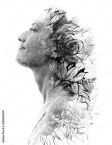 Double exposure. Paintography. Close up profile portrait of an attractive woman with strong ethnic features combined with unusual hand made drawings with floral and plant motifs, black and white