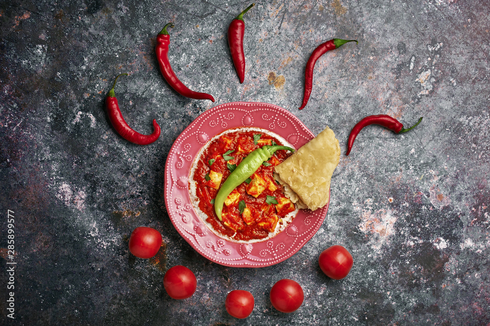 Paneer Makhani in pink plate decorated with tomatoes and chilli on dark background. Paneer Makhani is an indian cuisine curry with paneer cheese, tomatoes and spices.
