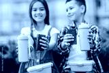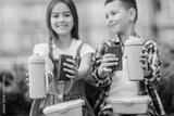 Close up photo. Thermos and sweets cake on friends hands.