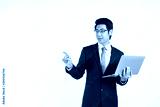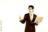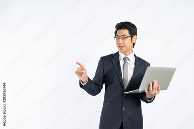 Smart Asian businessman holding laptop and point copy space for key words against white wall in studio