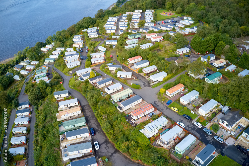 Caravan site park aerial view traveller holiday homes at Cloch site near Wemyss Bay