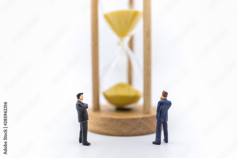 Business, Workin, Time and Management concept. Close up of two businessman miniature figure standing and looking to sandglass on white background.