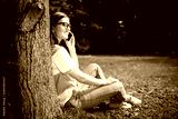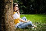 Young woman in glasses speaking on smartphone in park resting against a tree