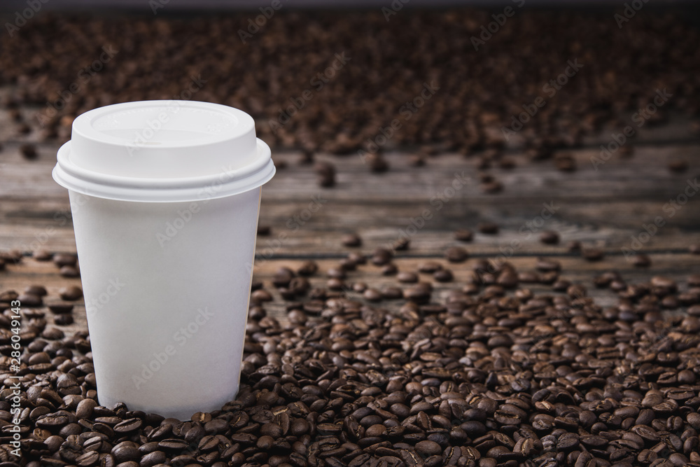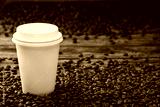 White takeaway cup of coffee with beans on brown wooden table