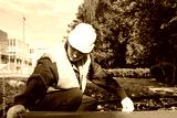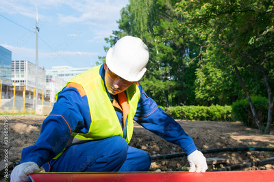 builder in a white helmet, measures the length of the red plastic pipe, yellow tape measure, to mark the size