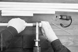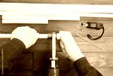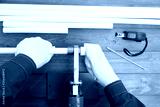 on a dark wooden background, the worker’s hands in white gloves, solder white polypropylene pipes with an adapter, measuring objects nearby