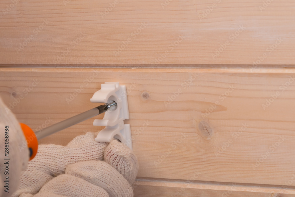 close-up of a screwdriver, tightens the fastening screws for laying polypropylene pipes