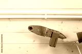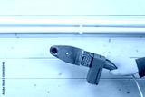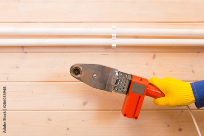 on a wooden background, the hand of a craftsman in yellow gloves, holds a soldering iron for repairing polypropylene water pipes