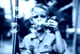 Little boy blowing bubbles. The concept of childhood.Black and white photo