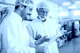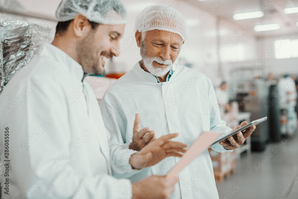 Two supervisors discussing about quality of food in food plant. Younger one holding folder with data while older one holding tablet. Both are dressed in white sterile uniforms and having hairnet.