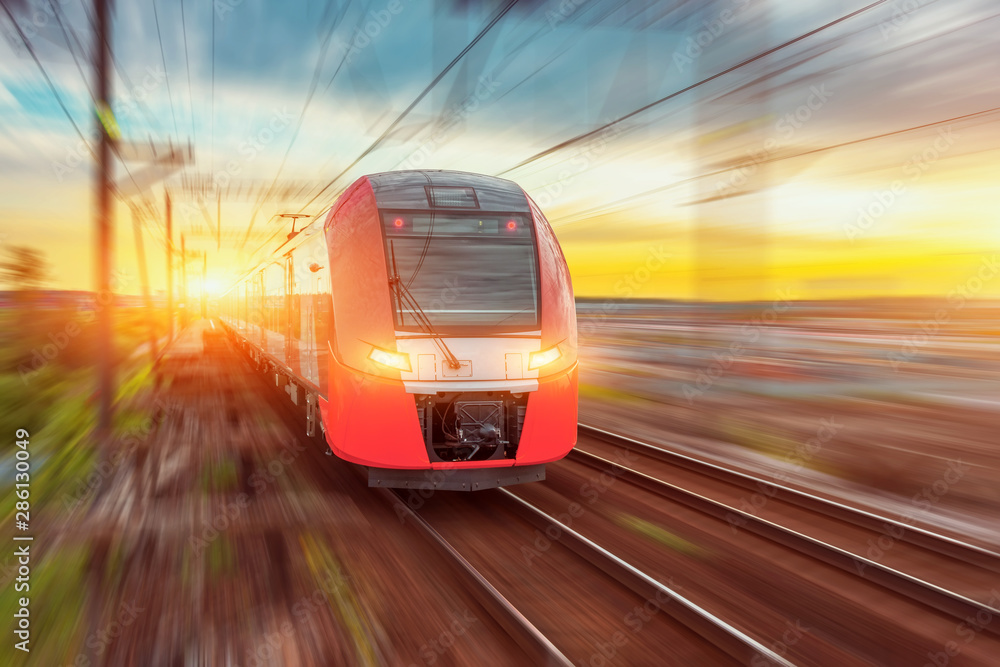 Electric high speed train rides past the passenger platform station in the city, evening rush hour at sunset.