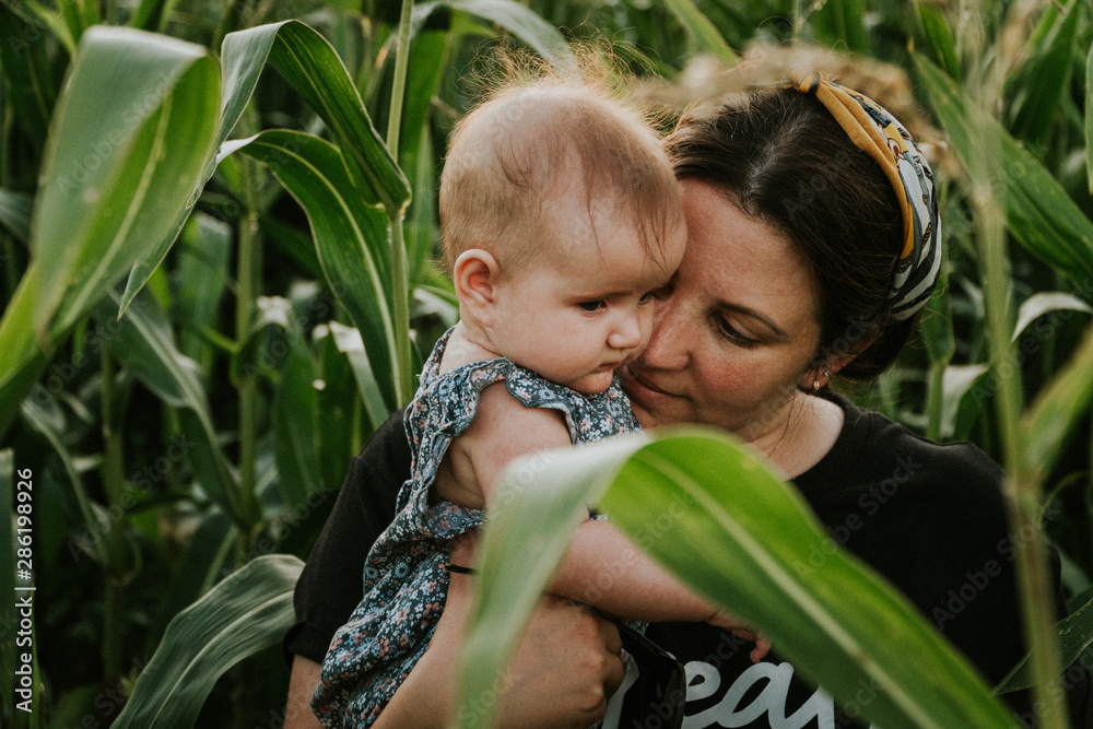 Mother in her thirties with daughter poses in corn field. Warm summer scenery.