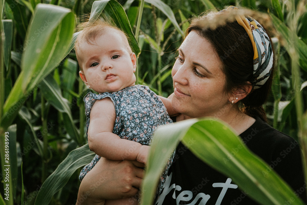 Mother in her thirties with daughter poses in corn field. Warm summer scenery.