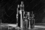 The vaping concept. Vaping and accessories on the table. Smoking electronic cigarettes. Smoking liquids. Vaping kit. Vaper accessories.