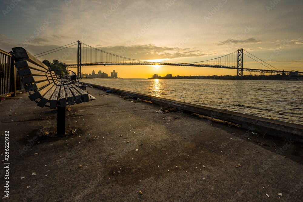 Sunrise at Ambassador bridge that connect between Detroit, US with Canada on Detroit river