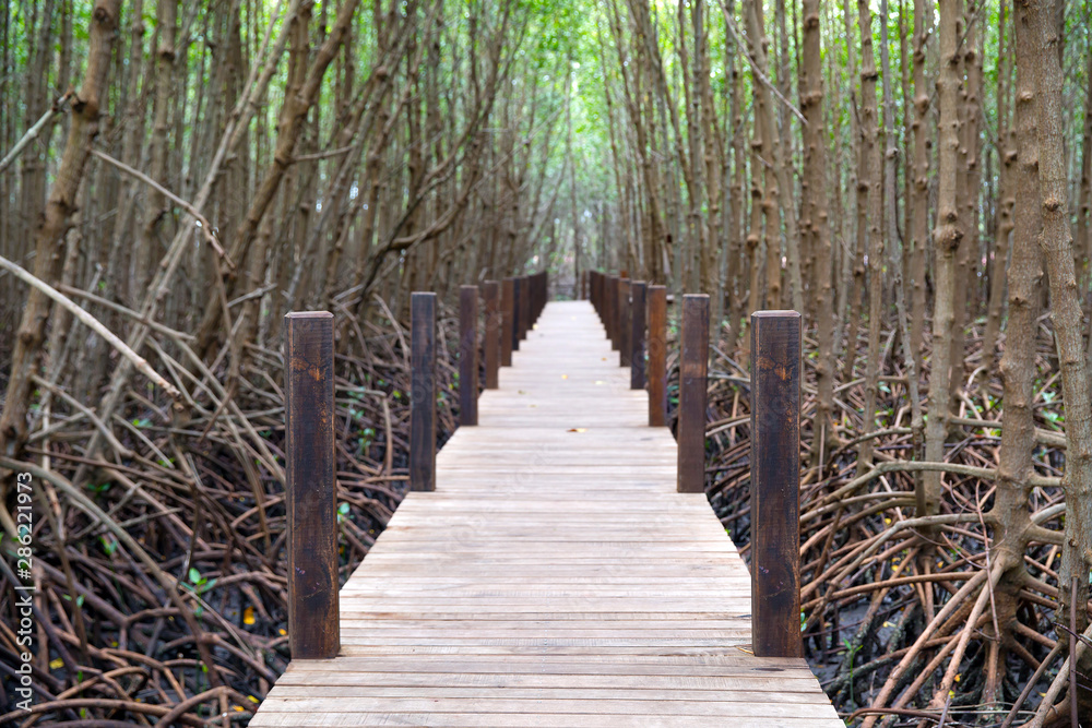 Picture of a wooden walkway to study the nature of the mangrove forest.