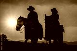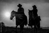 Silhouette of cowboys on horseback at sunset, sports and country lifestyle