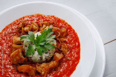 Spicy barley risotto with chicken and tomato sauce