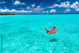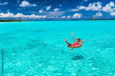 Beach winter holidays getaway vacation woman relaxing on pool float having fun swimming in ocean turquoise water. Caribbean tropical luxury resort destination.