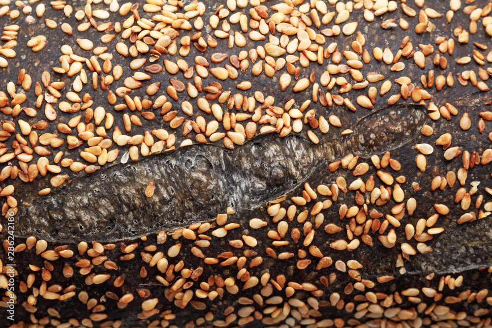 Homemade sourdough whole bread baguette as texture background. Food and culinary.