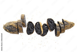 Homemade sourdough black bread baguette on white beackground. Food, baking.