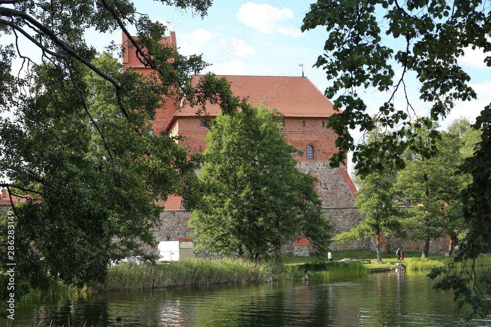 Medieval gothic Trakai Island Castle with stone walls and towers with red tiled roofs in Lake Galve, Lithuania