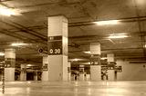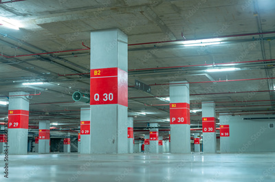 Empty underground car parking lot. Underground car parking garage at shopping mall or international airport. Indoor parking area. Concrete basement floor parking garage. Interior building in the city.