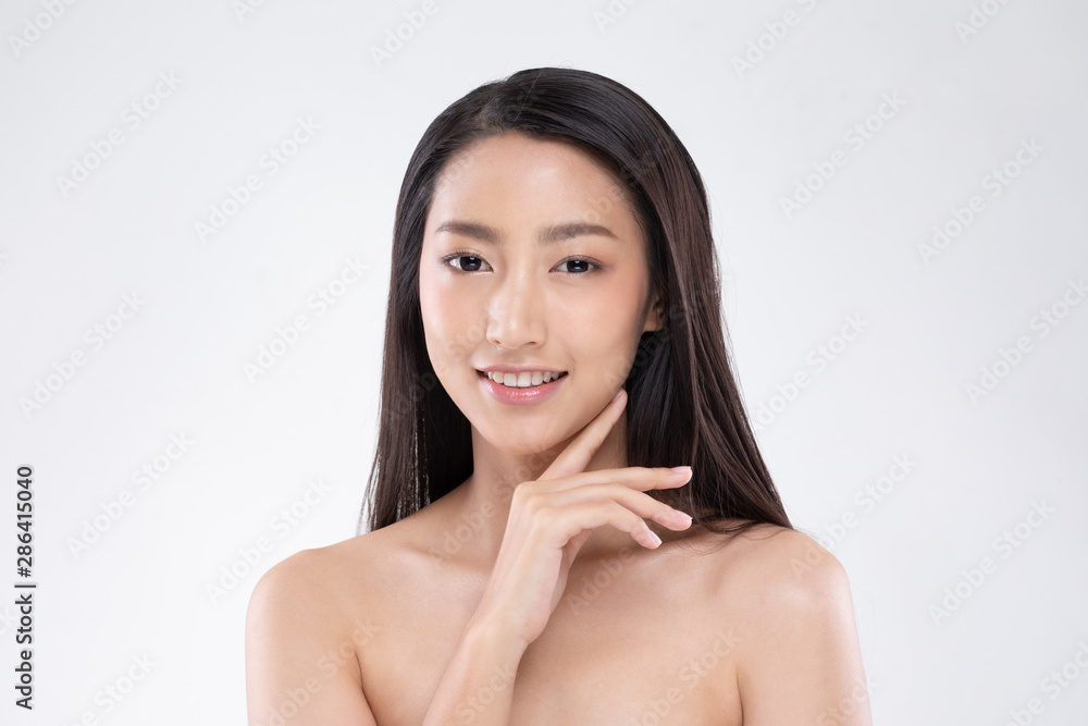 Beautiful Asian woman touching soft cheek smile with clean and fresh skin Happiness and cheerful with positive emotional,isolated on white background,Beauty and Cosmetics Concept