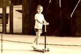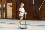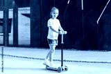 Girl in white t-shirt riding blue scooter